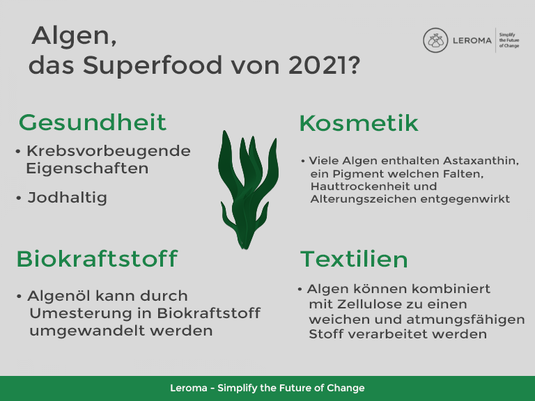 Mit diesem Artikel haben wir Ihnen einen Einblick in den unerschöpflichen Rohstoff aus dem Meer gegeben. Die Algen machen deutlich, dass wir nicht immer etwas komplett Neues entdecken müssen, um Innovationen voranzutreiben. Manchmal reicht es, wenn wir unseren Blick auf bisher unterschätzte Rohstoffe richten und ihr volles Potenzial entfalten. Wir von LEROMA werden weiterhin die Augen offen halten und Ihnen von innovativen Rohstoffen und Trends in der Lebensmittelindustrie zu berichten.