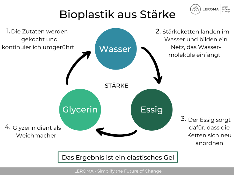 Dafür wird die gewonnene Stärke mit der gleichen Menge an Essig und Glycerin und der vierfachen Menge an Wasser vermischt. Das Gemisch wird bei Temperaturen zwischen 175 und 220 °C kontinuierlich gerührt, bis es dickflüssig wird. Die erhitzten Stärkekörner, die nur unter dem Mikroskop sichtbar werden, platzen, wenn sie erhitzt werden und die Stärkeketten landen im Wasser und bilden eine Art Netz, welches viele Wassermoleküle einfängt. Der Essig bricht diese Ketten auf, damit sie sich zu neuen, langen Ketten anordnen können und das Glyzerin fungiert als Weichmacher, welcher dem erzeugten Kunststoff Elastizität und Geschmeidigkeit verleiht. So entsteht ein elastisches Gel.