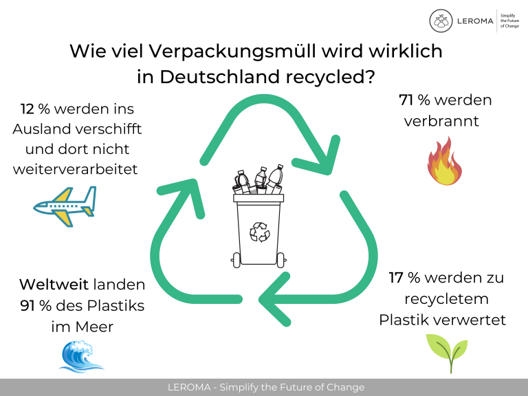 Obwohl in Deutschland laut Statistiken bis zu 70% des anfallenden Verpackungsmülls verwertet werden, wird gerade einmal 17% davon nachvollziehbar zu recyceltem Plastik verarbeitet, welches oft nicht dieselbe Qualität hat wie neues Plastik. Der Rest wird verbrannt. Darüber hinaus wird Verpackungsmüll auch dann als verwertet gezählt, wenn er zur Entsorgung in andere Länder exportiert wird. Verbraucher werden also mit Zahlen konfrontiert, die nicht vermitteln, was in Wahrheit vor sich geht.