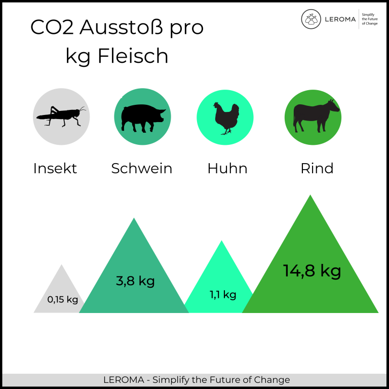Darüber hinaus können 80 bis 100 Prozent der Insekten verzehrt werden, womit der essbare Anteil fast doppelt so hoch ist wie bei Rindern, wo er 50 Prozent beträgt. Obendrein produzieren Insekten deutlich weniger Treibhausgase als konventionelle Nutztiere wie Schweine, die 10 bis 100 Mal so viel Emissionen erzeugen wie dieselbe Masse an Mehlwürmern.