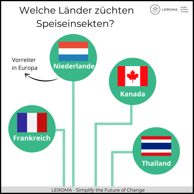 Seit dem 1. Januar 2018 ist der Verkauf von Insekten als Lebensmitteln auch in Europa erlaubt und inzwischen gibt es Insektenfarmen unter anderem in den Niederlanden, in Frankreich, in Spanien und in Kanada. In der Schweiz sind Mehlwürmer, Grillen und Heuschrecken schon seit 2017 als Nahrungsmittel zugelassen.