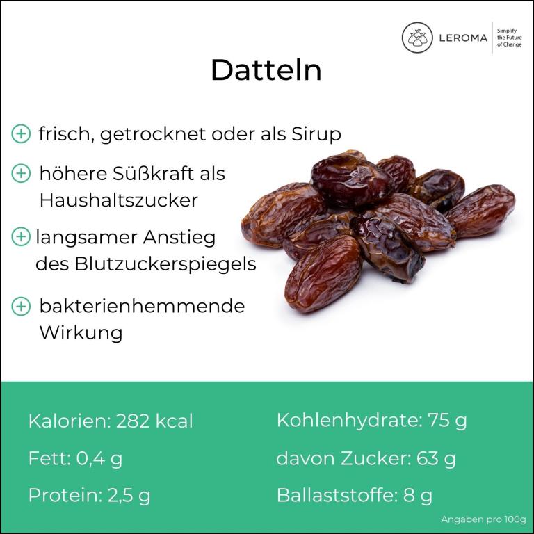 Neben Datteln können auch getrocknete Rosinen, Pflaumen und Feigen zum Süßen verwendet werden, da Trockenfrüchte durch den Entzug von Wasser eine höhere Konzentration an Fruchtzucker enthalten.
