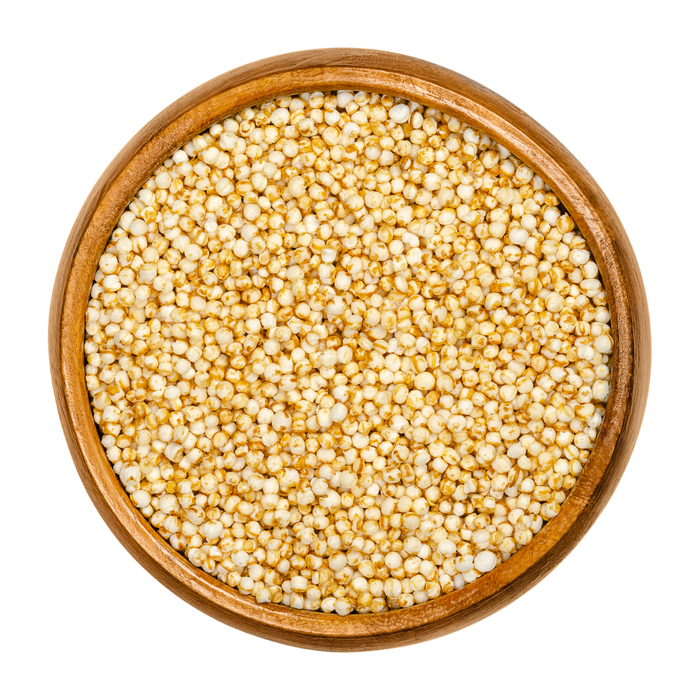 Reife, trockene, ganze entspelzte und gepuffte Samen von Chenopodium quinoa.
