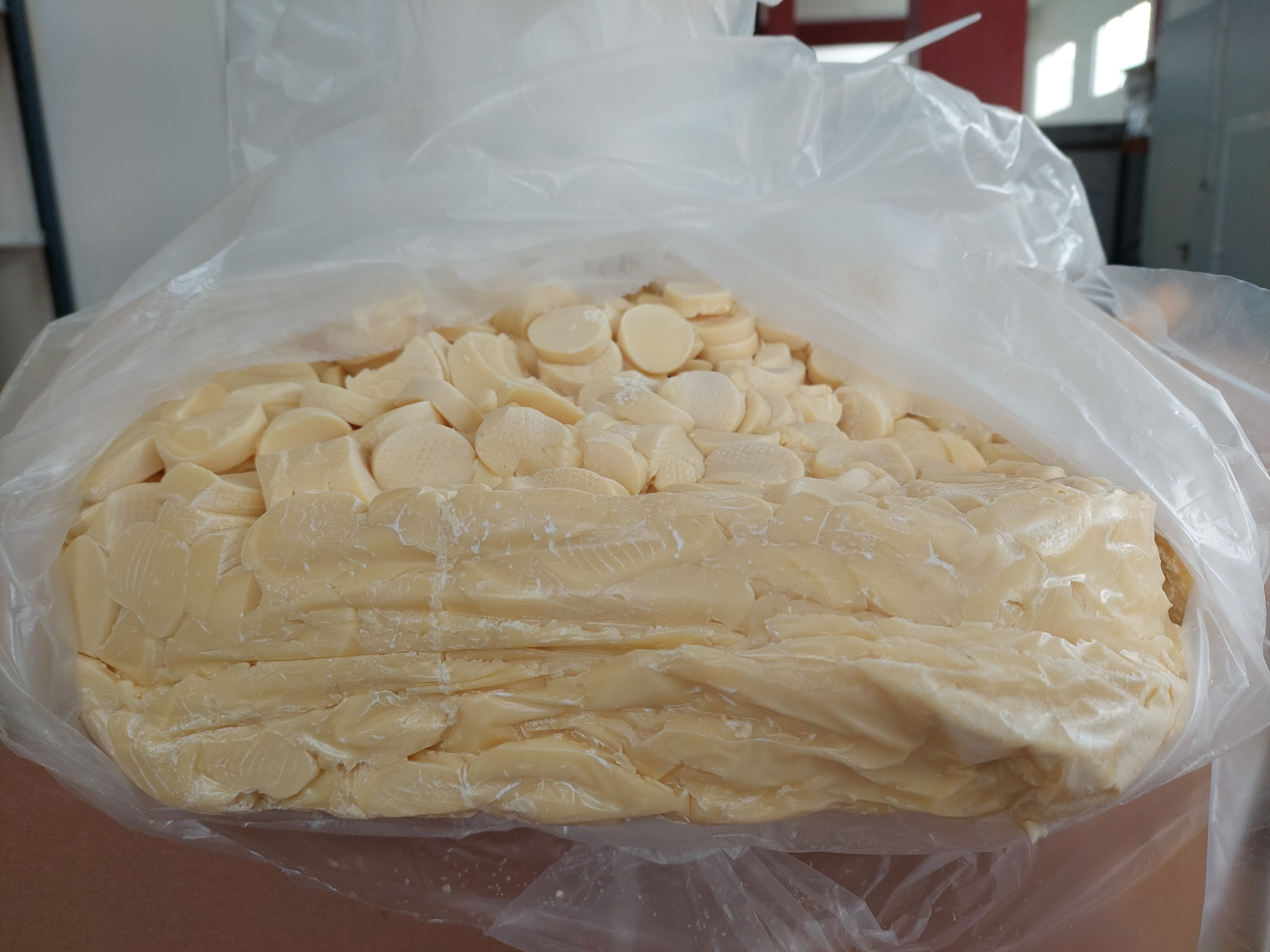 Organic cacao butter is obtained from organic cacao beans, shelled, grinded and refined which has been pressed for the extraction of organic cacao butter. The Raw Cacao butter is then put in moulds and packed. Industrial usage: confectionery, pastry, and chocolate-flavoured products.