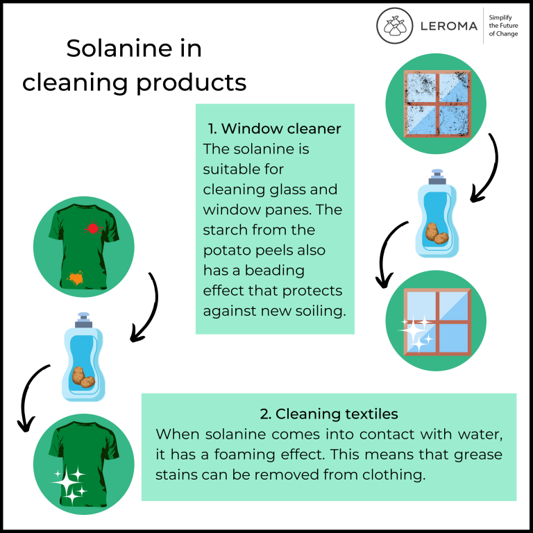 ingredient in cleaning agents. Solanine dissolves grease and even produces a soap-like foam when it comes into contact with water. Thus, a biological detergent made from potato peels can be used to remove grease stains from clothing, or to clean carpets and stainless steel surfaces. In addition, it can also be used to clean glass, such as window panes. The starch contained in the potato peels additionally causes a beading effect there, which protects against new soiling. Furthermore, potatoes and their peels contain oxalic acid, which is also found in chemical cleaning agents and can dissolve rust and lime.