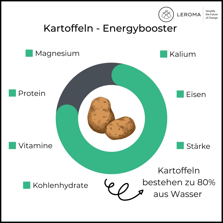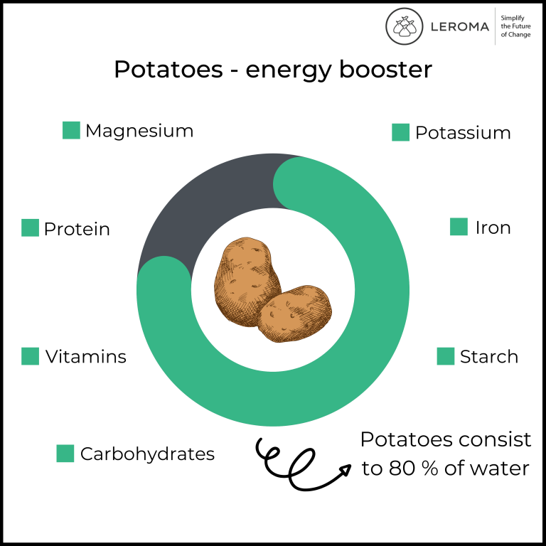 Potatoes consist of 80% water and are rich in vitamins, proteins, minerals such as potassium, magnesium and iron, and carbohydrates. They also contain starch, few calories and virtually no fat.