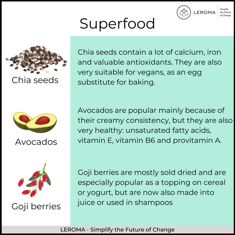 Although there is no fixed definition for the term "superfood", it is usually used to describe plant-based foods that are said to have health-promoting properties. Avocados, chia seeds, the leaves and seeds of the quinoa plant and many other popular superfoods are characterized by their high nutrient content and antioxidant effects.