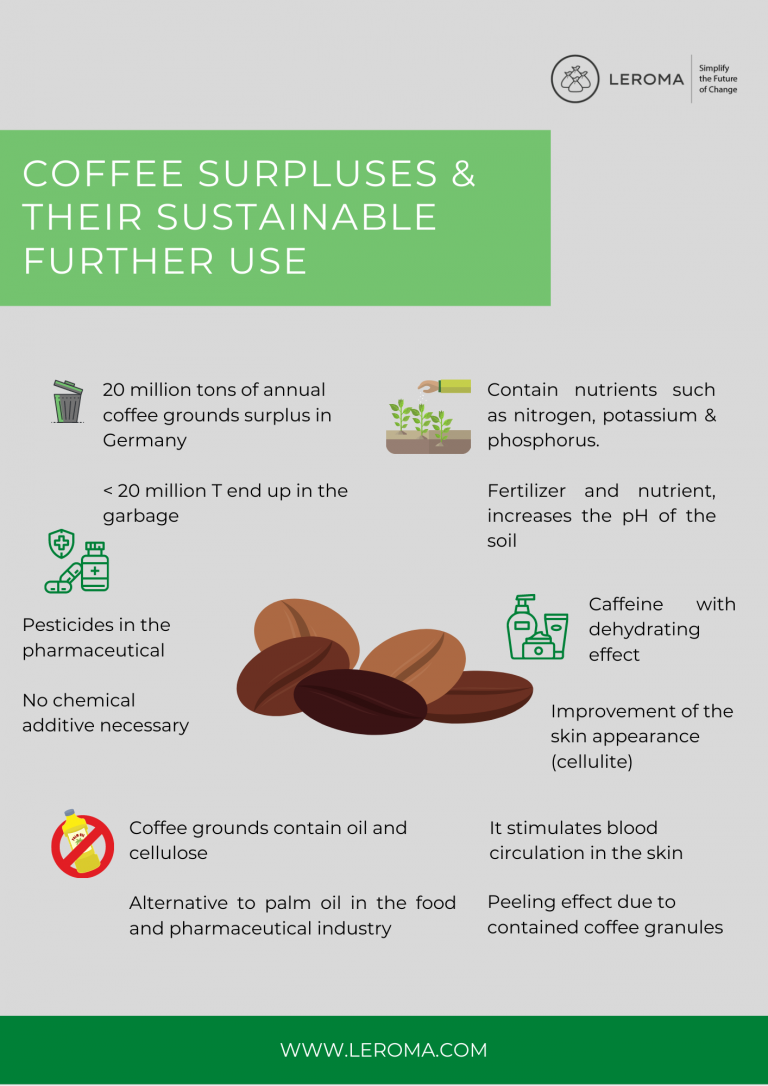The opportunities highlighted for the use of coffee byproducts illustrate the impact that cross-sector collaboration can have. It is the vision of Marina, the founder of LEROMA, that passing on raw materials, surpluses and residues becomes an everyday practice and that together we create a sustainable circular economy. With the surplus exchange, we provide you with an important tool. It offers a great opportunity to find potential customers for your leftovers!
