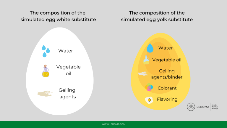 In addition to the amount, the type of ingredients included also varies according to preference and intended use. Thus, the vegetable oil used can be coconut oil as well as cottonseed oil, peanut oil or safflower oil. The oil is important in giving the simulated egg white the appearance and texture of a natural egg.