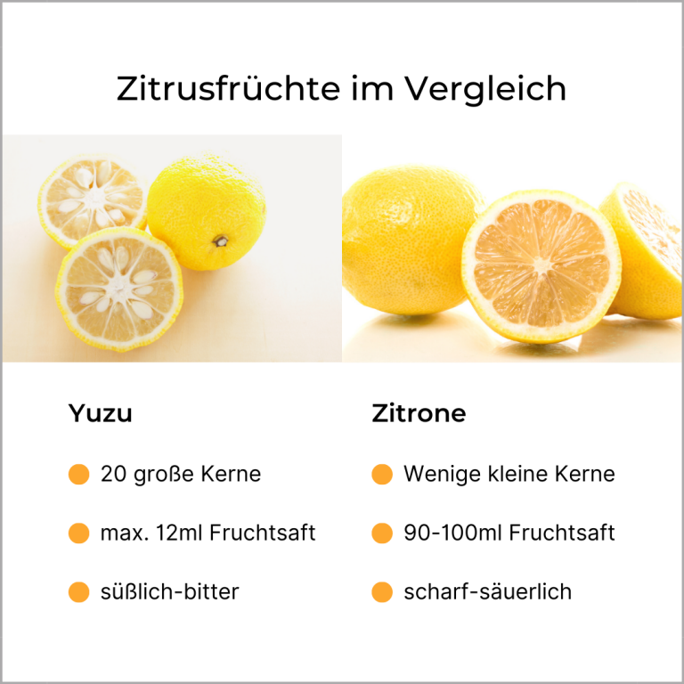 maximale Menge von ca. 12 Milliliter Fruchtsaft während des Pressvorgangs entnommen werden. Als Folge der großen Kerne bietet die Yuzu dementsprechend auch wenig Fruchtfleisch. In der Regel besitzt eine einzige Yuzu-Frucht um die 20 große Kerne. Um 100 Milliliter Saft zu erhalten, muss man ungefähr ein Kilogramm Yuzu auspressen. Die größte Differenz der beiden Früchte verbirgt sich im Aroma. Während das Saure bei der Zitrone die Überhand nimmt, ist das Aroma der Yuzu um einiges komplexer und schwierig in Worte zu fassen.
