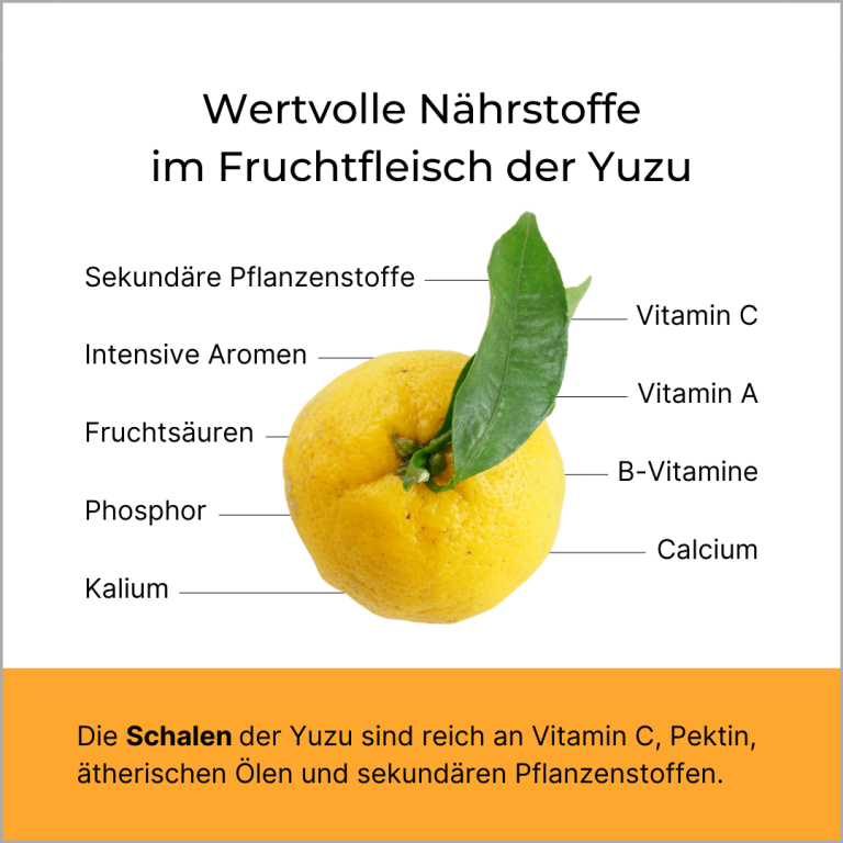 Calcium. Neben der Anwendung in der Lebensmittelindustrie fungiert der Duft der Yuzu auch als Treiber für Ruhe und Entspannung. Yuzu-Aromen haben eine stressreduzierende Wirkung auf den menschlichen Organismus, ähnlich wie die