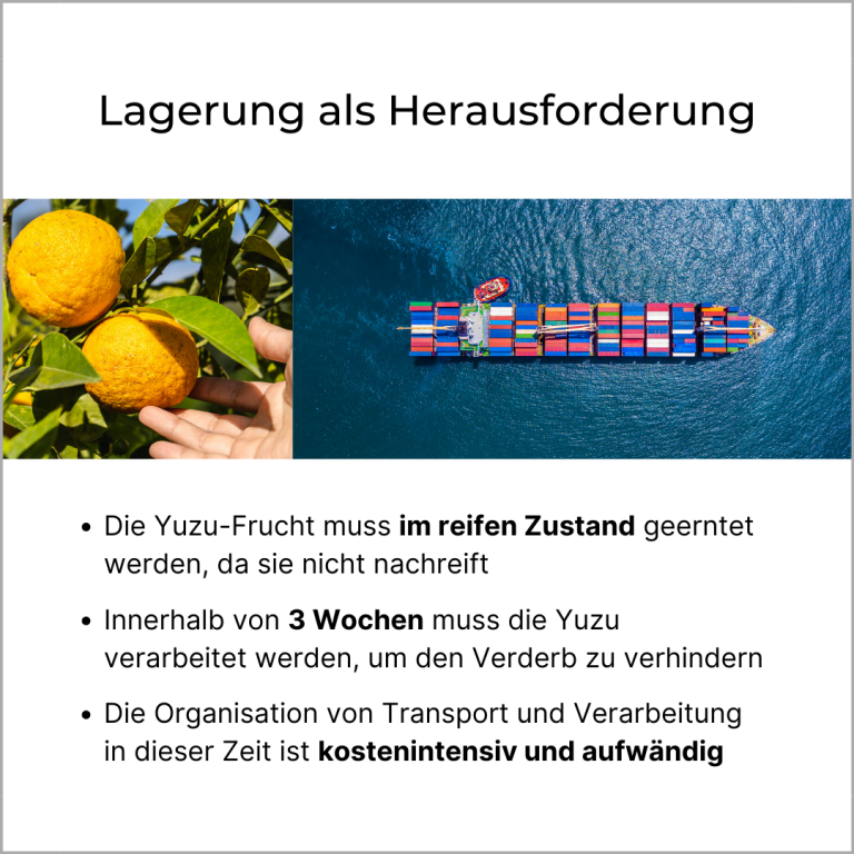 dreiwöchiger Zeitraum, in dem die Yuzu bearbeitet werden muss. Sonst verdirbt sie und wird ungenießbar. Die Organisation und Durchführung von Logistik und Transport sowie die anschließende Verarbeitung in Europa stellt in diesem Zeitraum jedoch eine große Herausforderung dar. Dieser komplette Prozess ist sehr kostenaufwendig, zeitintensiv und rechtfertigt die hohen Verkaufspreise im europäischen Raum.
