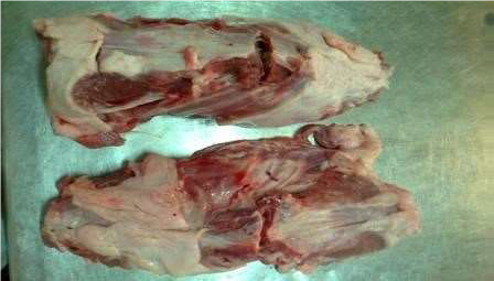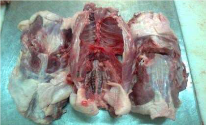 Gänsekorpus umfasst die Rippen und den Teil der Wirbelsäule zusammen mit angrenzenden Muskeln und Haut. Gefroren - Oberfläche trocken.